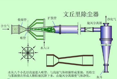 文丘里是一款新型除塵器,在水膜除塵器煙氣進口管道上安裝一個文丘里流道,在文丘里喉口噴水,因吸水凝聚成較大的顆粒。